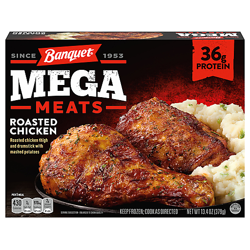 Banquet Mega Meats Cowboy Chicken with Homestyle Mashed Potatoes frozen meal brings two classics to your table in minutes. Featuring an herb-roasted chicken thigh and chicken drumstick with mashed potatoes for delicious frozen meals. This frozen chicken dinner offers 36g protein per serving to put hunger in its place. Enjoy Banquet Mega Meats as flavorful frozen lunches or quick and easy frozen dinners any day of the week. Preparation of these ready made meals is easy. Just follow the instructions on the box to heat the frozen food in the oven for fresh-baked flavor or in the microwave for quicker cook time. Store the 13.4 ounce frozen chicken meal in the freezer until you’re ready to enjoy. Banquet Mega delivers hearty meals that will keep bringing you back for more.