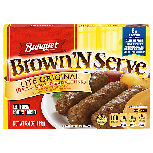 Banquet Brown 'N Serve Lite Original Sausage Links frozen meat brings hot breakfast to your family's table in minutes. This gluten free frozen breakfast sausage made with pork and turkey, features 8g protein per serving and 50% less fat and 35% fewer calories than Banquet Original Sausage Links, making these great sausages for breakfast any day of the week. Enjoy Banquet frozen sausage as a convenient accompaniment to your favorite breakfast food, or as a quick, savory snack. Preparation of this frozen food is quick and easy. Follow the instructions on the package to prepare the frozen sausage links in a skillet for that fresh, out-of-the-pan taste, or microwave and let stand for a quicker cook time. This sausage link box is well-sized for easy freezer storage. in the U.S.A. for over 60 years, Banquet has been making delicious food the whole family loves.
