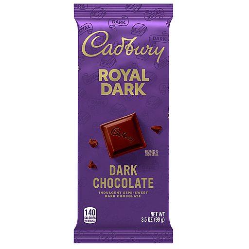 Bow down to royalty! Crafted from a semi-sweet dark chocolate candy bar, the CADBURY ROYAL DARK is a rich and invigorating treat that'll satiate your need for a tasty treat. It's the perfect balance of flavor with its decadent and velvety smooth dark chocolate finish. Take some time for yourself and enjoy a few bites straight out of the wrapper. Also, it's a convenient snack for someone who's on the go. Simply break off a piece whenever you need a sweet pick me up. With this dark chocolate candy, you can even think about adding a special touch to your baking prep! Carefully melt the CADBURY chocolate, then drizzle and swirl it over sweet and salty snacks alike, including pretzels, fruit, marshmallows and assorted nuts. Take a CADBURY ROYAL DARK chocolate bar to work for a midday treat with your co-workers, or add some to gift baskets to share the timeless taste of indulgent semi-sweet dark chocolate. These candies also make unique chocolate gifts during Valentine's Day, basket fillers at Easter, stocking stuffers throughout the holidays and Halloween treats during trick-or-treat season. Get ready to please the crowd whether you're celebrating a holiday or just enjoying an ordinary sharing moment with CADBURY ROYAL DARK chocolate candy you'll swear tastes better with every bite.