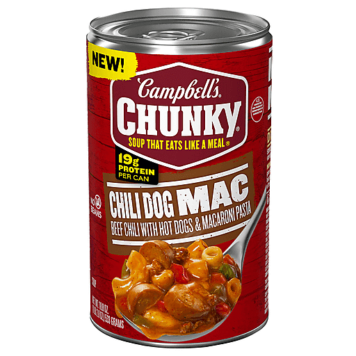 Tackle your hunger with Campbell’s® Chunky® Chili Dog Mac Soup. This canned chili mac soup features hot dogs, enriched macaroni pasta, red and green peppers, seasoned beef, and no beans for a comforting taste that’s just like mom used to make. With 19g of protein per can, it’s a satisfyingly chunky hot dog and beef chili mac that fuels even the heartiest of appetites. Campbell’s® Chunky® Soup is a year-round pantry staple and the MVP of game day snacks, delivering a winning combination of flavor and convenience. Enjoy a warm bowl of this canned soup when watching the game from home, or savor it at your next tailgating event. To prepare the microwave soup, simply pour into a microwave-safe bowl and heat — do not add water. Or heat in a saucepan on the stove, stirring occasionally. Whether you’re a football fan or simply craving something hearty, Campbell’s® Chunky® Chili Dog Mac Soup will keep you feeling full and satisfied from kickoff to the final whistle. Make every game day a winner with Campbell's® Chunky® – Soup That Eats Like a Meal.®