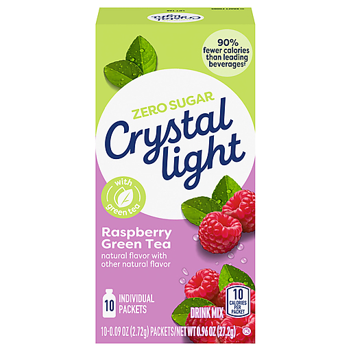 Crystal Light Naturally Flavored Raspberry Green Tea On-The-Go Powdered Drink Mix is a light and refreshing beverage you can enjoy at any time of day. With zero grams of sugar and 10 calories per packet, Crystal Light raspberry iced tea mix is a sweet alternative to juice and soda and has 90 percent fewer calories than leading beverages (this product 10 calories, leading beverages 70 calories), so you don't have to choose between taste and calories. Its also made with real green tea for a refreshingly smooth taste. Each 0.09 ounce individual packet in this 10 count box of powdered iced tea mix easily fits in your bag, desk or car, so you can enjoy a refreshing glass of Crystal Light anywhere. Simply empty one packet into a bottle of water or a glass with 2 1/2 cups of water, shake or stir, and enjoy! All the flavor and only 10 calories per packet, just the way you like it.