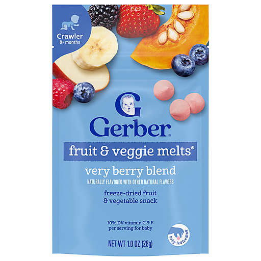 Gerber Very Berry Fruit and Veggie Melts are made with wholesome ingredients and strict quality standards just for babies. This baby finger food dissolves easily and is perfect for little hands learning to pick things up. Specially crafted to delight your little one, these fruit and veggie melts are stage 3 baby food snacks--designed for children 8 months and older. Gerber understands the importance of providing nutritious food as your baby grows and develops, which is why this baby finger food is made with real fruit and veggies. Our dedication to quality and nutrition has been and always will be our highest priority. We're committed to being your partner in parenthood with strict quality standards, nutritious food & expert guidance. Gerber baby snacks are a trusted choice for countless families.