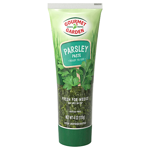 Parsley- especially when it's Gourmet Garden Parsley Stir-In Paste- can be used for so much more than traditional garnish. Our paste is an easy way to add vibrant, aromatic flavor to poultry, seafood, eggs, potatoes and grains. No chopping needed, and no wilted herbs to discard! Parsley paste is at its best flavor, color and aroma when it reaches your family's table. Freshly picked bunches of parsley are washed, chopped and packaged in a convenient squeeze tube. All you need to do is stir into your favorite recipes for soups, pasta, marinades and more. Use 1 tablespoon of paste for 1 tablespoon of fresh parsley. Store refrigerated for weeks after opening.