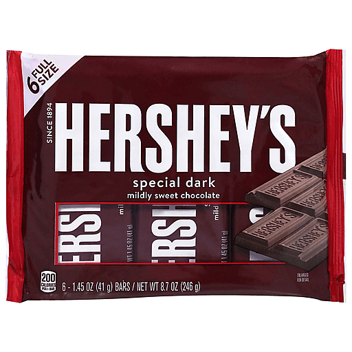 There's happy, and then there's HERSHEY'S happy. Made of the delectable, rich, sweet chocolate that's been a classic for decades, HERSHEY'S SPECIAL DARK mildly sweet chocolate bars make life more delicious whether they're enjoyed alone or shared with loved ones. These individually wrapped, full size kosher candy bars are the perfect treat for countless special and everyday occasions. They can be used to stuff Christmas stockings, stock up for Halloween trick-or-treat bags, fill springtime Easter baskets and create Valentine's Day gift bags and party favors for everyone you love. Keep some on hand for guests and store a few in your pantry for convenient snacking when the mood strikes. Show up to movie night with full size HERSHEY'S mildly sweet bars to please the whole crowd and perfect the night's snack selection. You can even sweeten up your favorite desserts by topping cupcakes, brownies, cookies and other baked goods with a block or two of this divine chocolate. Or, try a twist on a classic by making s'mores with HERSHEY'S SPECIAL DARK chocolate bars for a delectable, melty treat. Everyone is excited when they're reaching for HERSHEY'S SPECIAL DARK mildly sweet chocolate candy bars, and now you can be too!