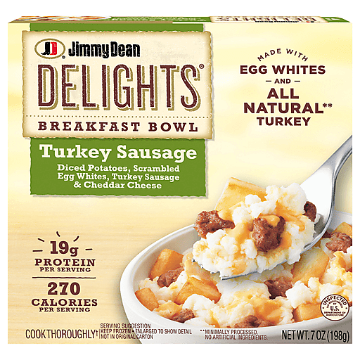 Jimmy Dean Delights Turkey Sausage Breakfast Bowl contains all the breakfast favorites. This microwavable breakfast is filled with turkey sausage, eggs, diced potatoes, and cheese. With 19 grams of protein per serving, this turkey sausage breakfast bowl helps fuel the day. Simply microwave and serve for an easy breakfast. Ensure the frozen breakfast bowl is cooked thoroughly before enjoying. Keep frozen to preserve freshness.