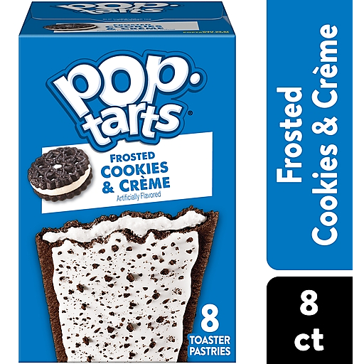 Pop-Tarts toaster pastries are the perfect sweet treat at breakfast, for lunch snack time, or dessert. Featuring a sweet cookies and creme-flavored filling and sprinkles on a soft pastry crust, this ready to eat treat is perfect for snack time for kids and adults on the go. Pack Pop-Tarts Frosted Cookies and Creme in lunchboxes or backpacks when it's time for school snacking, or stock the office pantry with this individually wrapped grab and go adult snack time choice. Pop them in the toaster and pair with milk, create your own ice cream sandwiches, or incorporate into your favorite dessert recipe for a sweet treat. These irresistible snack time options for kids and adults provide a good source of three B vitamins. Stock your pantry with these shelf stable snack alternatives and enjoy ready to eat treats anytime. A flavor for everyone, including beloved classics like Frosted Strawberry or Frosted Cherry, or our more indulgent flavors, Frosted Brown Sugar Cinnamon or Frosted Chocolate Fudge.