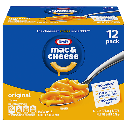 Help yourself to a bowl of comfort. Kids and adults love the classic taste of Kraft Original Mac & Cheese Macaroni and Cheese Dinner. Our 7.25-ounce mac and cheese box includes macaroni pasta and original flavor cheese sauce mix, so you just need milk and margarine or butter to make tasty mac and cheese kids love. Our warm, cheesy macaroni goodness fills your belly and feeds your soul. With no artificial flavors, preservatives or dyes, Kraft Macaroni and Cheese is always a great choice for family dinners. Looking for quick meals, sides or kids meals? Our beloved Blue Box mac and cheese brings easy meals together. Simply boil water, stir in macaroni and cook 7-8 minutes. Drain the macaroni and return to the pan. Then add margarine or butter, milk and cheese sauce mix, and mix well. Stir up new ways to enjoy Kraft Mac n Cheese by adding protein or seasonings to make it your own. Try crispy bacon, shredded rotisserie chicken, steamed broccoli, hot sauce, and more! A wholesome tradition, Kraft Mac & Cheese has been bringing generations together since 1937. Kraft Mac & Cheese inspires the positive power of comfort, so stock up with our 12 pack of dinner sides and enjoy cheesy goodness anytime.