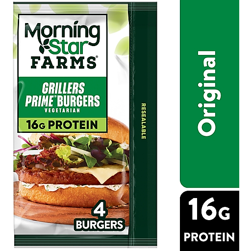 MorningStar Farms Grillers Prime veggie burgers offer a classic, char-grilled taste and great texture in every savory bite. These hearty meatless patties pack 16g of protein per serving (22% daily value) and deliver a delicious taste. With 56% less fat than regular cooked ground beef*, these vegetarian burgers are an excellent choice for a balanced diet. Made with high-quality ingredients and no artificial flavors or colors, they are a healthy and tasty option; Keep a convenient resealable bag in your freezer for a hearty meal starter anytime. Load up these veggie burgers with all your favorite toppings and pair them with summer sides like potato chips and salads. Whether you're looking for a quick lunch, dinner, or grilling for a summer BBQ, MorningStar Farms Grillers Prime veggie burgers are sure to delight both vegetarians and meat-lovers alike. *Cooked regular ground beef patties contain 15g total fat per serving (71g). MorningStar Farms Grillers Prime Burgers contain 7g total fat per serving (71g).