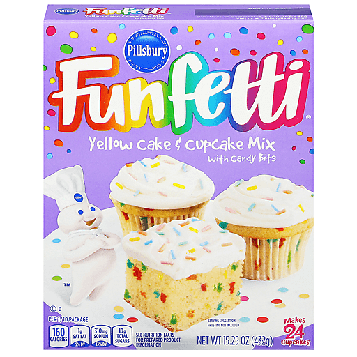 Easily prepare a delicious dessert with Pillsbury Funfetti Yellow Cake Mix. Pillsbury Funfetti cake mix delivers the classic taste of yellow cake with a moist texture and easy-to-follow instructions, plus the fun addition of colorful candy bits. Pillsbury Funfetti yellow cake mix contains all the dry ingredients you need to create delicious desserts at home in just three steps. Simply add water, vegetable oil and eggs to the dry baking mix, and stir to combine. After mixing the ingredients, bake your cake according to the time given on the box. This boxed cake mix makes enough batter for a 13 by 9 inch cake, two 8 inch round cakes or a standard Bundt cake. It can also be used as a cupcake mix to make up to 24 cupcakes. Decorate the cooled yellow cake with Pillsbury Funfetti frosting or make your own cake creations like cake pops or a trifle for an extra special treat. Pillsbury Funfetti Yellow Cake Mix is great for celebrations, an after dinner surprise or special occasions, big and small. The Funfetti cake mix comes in a 15.25 oz box that is easy to store in the pantry for a ready to prepare birthday cake. Pillsbury Funfetti cakes will take your next party or get-together to the next level. The Pillsbury Baking website has delicious and easy recipes, fun ideas and simple baking tips to help you and your family create tasty memories together.