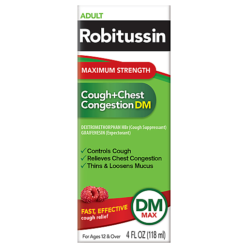 Frequent coughs and chest congestion have met their match. Get fast, effective relief from your worst cold symptoms with Robitussin Maximum Strength Cough + Chest Congestion DM. This non-drowsy cough medicine not only works to control your cough, but it also thins and loosens mucus to help make your coughs more productive. The strong, soothing action of max-strength Robitussin Cough Syrup comes in a great raspberry flavor — also available in liquid-filled capsules. For adults and children ages 12 and over, Robitussin Maximum Strength Cough + Chest Congestion DM should be taken in 20 mL doses every four hours; do not take more than six doses in any 24-hour period. For nighttime cough relief, try Robitussin Maximum Strength Nighttime Cough DM.