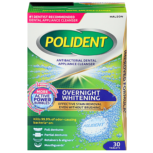 Introducing an improved formula (1) from Polident, the #1 Dentist Recommended Dental Appliance Cleansing Brand, now with more active power bubbles (1) for an amazingly clean dental appliance every day! Polident Overnight Whitening Antibacterial Dental Appliance Cleanser delivers effective stain removal without brushing with a specially designed formula for dental appliances, including full dentures, partial dentures, retainers, aligners, and mouthguards (3). Offering a 360-degree deep clean (4), the active power bubbles in Polident Dental Appliance cleansers actively clean even the hardest to reach places (2) and keep your dental appliance fresher for longer (5). Use daily as directed for the best clean and a clean, fresh, healthy smile.(1) Vs. previous Polident range(2) In laboratory tests(3) Suitable for common dental appliances(4) When used as directed(5) Vs. no tablet