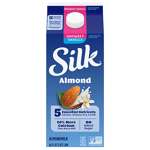 Treat yourself to this smooth and seriously creamy Silk Vanilla Unsweet Almondmilk. Enjoy all of the taste with 0 grams of sugar per serving*. Made with three kinds of almonds grown by Mother Nature and picked at the peak of ripeness, this lactose free milk has a perfect mix of quality and flavor. Plus, its smooth vanilla flavor makes it an extraordinary tasting plant based milk that you can use throughout your day. It tastes great in a bowl of cereal or in your favorite smoothies. Every serving of this non dairy milk has Vitamin D to help support strong bones and 50% more calcium than dairy milk**. Silk Almondmilk is totally free of dairy, soy, lactose, gluten, casein, egg, and MSG. Looking for lactose free cooking or baking supplies? Silk Almondmilk makes an excellent addition to sauces and baked goods. Whether you’re making a bowl of cereal, drinking straight out of a glass or enjoying it as a non dairy coffee creamer for a frothy coffee, trust Silk — the Original Plant Pioneer. Today Silk supports regenerative agriculture because we believe in the power of plants for people and the planet. It’s not just almondmilk, it’s Milk of the Land***. Read more about our story on our packaging. Enjoy all of the Silk products, including vegan milk, non dairy creamer and dairy free yogurt varieties. *See Nutrition Facts for sugar and calorie content. **Silk Unsweet Vanilla Almondmilk: 470mg of calcium per cup; reduced fat dairy milk: 309mg of calcium per cup. USDA FoodData central, 2022. ***From plants, not cows. Not nutritionally equivalent to dairy milk.
