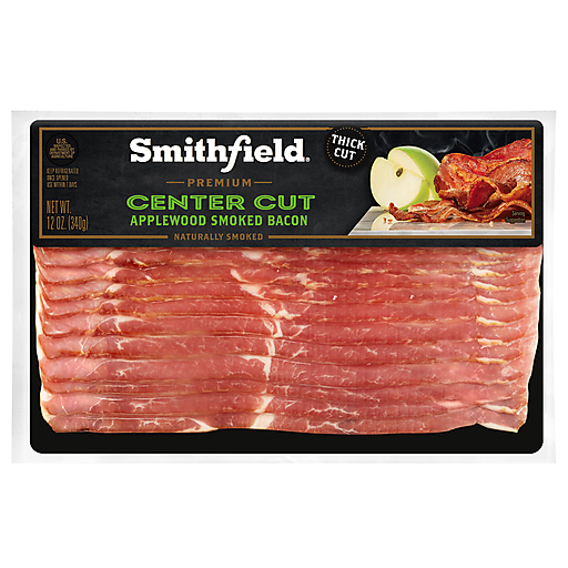 All Smithfield brands are driven by the love of meat. That's why our offerings are so vast: because we all need our pork and specialty prepared meats our way. Smithfield Applewood Smoked Center Thick Cut Bacon delivers the authentic hickory smoked flavor of Smithfield pork bacon to your meals. Expertly cut from the middle part of the pork belly, these hickory bacon strips contain 30% less fat than regular Smithfield bacon, with the delicious flavor you love. It's hand-selected and hand-trimmed to ensure high-quality, flavorful bacon that has no MSG and no artificial flavors or colors and is a product of the USA. The naturally hickory smoked flavor is rich, enhancing every bite with premium taste. Serve this reduced fat sliced bacon with eggs and potatoes for a perfect breakfast, elevate lunchtime sandwiches or serve up delicious bacon slices as a hearty addition to pasta. This Smithfield hickory smoked bacon also makes an ideal addition to breakfast sandwiches, lunch wraps or tasty snacks. Keep Smithfield Applewood Smoked Center Thick Cut Bacon refrigerated. Smithfield has set sustainability goals because we believe we can build a more sustainable business and contribute to a better future.